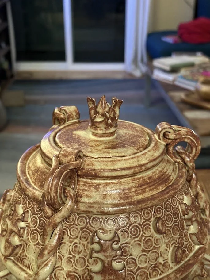 A celebration of exploration. I didn’t have any specific ideas while working on this jar, other than just having fun exploring the applique decoration concepts that inspired this series. Lots of sketches, experiments, backtracking, retracing, backtracking again, and then finally deciding to see what the kiln gods had to say about matters. This was the first jar in the series, and basically every shape and concept on the other jars have their roots in experiments I did here. By some miracle, it all came out looking like a cohesive piece, so even if it doesn’t have a proper name, I thought it deserved a spot in the final set.
