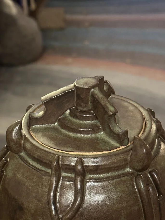 This series has its roots in a workshop I took learning about Jomon decorating techniques in neolithic Japanese ceramics. I’ve heard many people say that Jomon pieces seem weirdly contemporary, like something experimental from the 60s or 70s instead of thousands of years in the past. As part of practicing the appliqué surface decoration I learned in the workshop, I created a series of jars that try to capture the bits I liked about that ancient-yet-outside-of-time look. I tried to stick with a visual language that would be recognizable anywhere and at any time: circles, lines, knots, fire, seeds, flowers, wings, horns, etc. When it came to finishing the jars, I wanted the pieces to have a feel of being pulled out of an ancient burial site, like something made of patinaed bronze or worn, mossy stone.